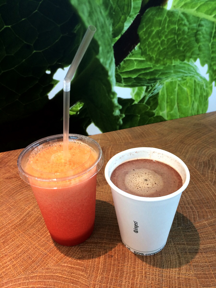 Parce que je sais aussi me réjouir de choses simples, j’ai été chercher un chocolat chaud maison « spécial Noël » au lait de riz et d’amande bio à la cannelle, noix de muscade, cardamome et clous de girofle avec un jus d’orange-framboise pressé à la minute chez Takinoa au centre-ville de Lausanne.