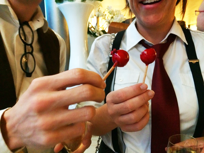 Quant aux déguisements, tout le monde ou presque a joué le jeu et c’était amusant de constater les différentes « écoles » représentées, certains arborant l’uniforme des sorciers de Poudlard alors que d’autres étaient plus classiques (je portais un pullover marine sur un chemisier blanc, une cravate rouge rayée empruntée à Lui, une mini jupe Alberta Ferretti en laine grise et des chaussettes montantes Burlington assorties) ou carrément élèves caillera en jean, sweatshirt et casquette vissée sur le côté.
