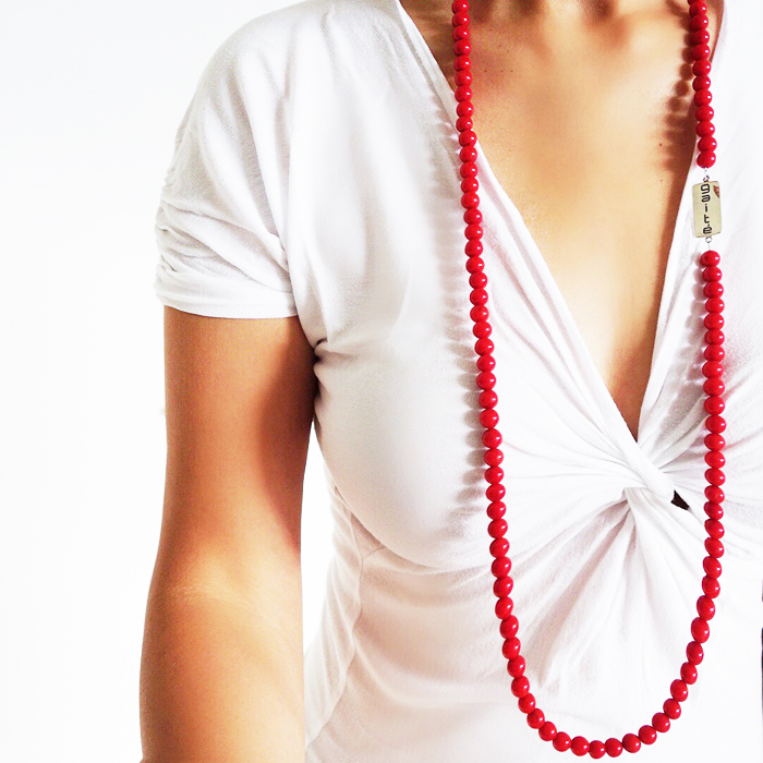 Je n’avais pas prévu d’acheter un collier, qui constitue mon achat de la semaine no 50, mais au hasard des surprises de mon calendrier de l’Avent virtuel, je me suis laissée tenter par une vente privée à l’Institut Bien-Être à Clarens avec ma copine Madame. J’ai regardé tout d’abord la sélection de bijoux de cette marque suisse fondée par deux femmes talentueuses, Nathalie Vas et Paola Limonta, présente ce jour-là, sans arriver à me décider (un bracelet-ruban de femmes exceptionnelles aux prénoms gravée d’Ella (Maillart), de Marie (Curie), d’Oriana (Fallaci) ? un sautoir Audrey (Hepburn) ?), ai discuté un moment avec Paola qui m’a expliqué la philosophie de Be Uzume (promouvoir la personnalité et l’engagement des femmes célèbres, célébrer la liberté et la gaîté sous l’égide de la déesse japonaise Uzume, produire de beaux bijoux en matière noble : argent et pierre fine comme l’onyx, la pierre de lune ou la labradorite) puis suis retournée examiner les créations de plus près avant de m’arrêter devant le sautoir « Bonne Humeur » d’un beau rouge corail que j’ai passé à mon cou pour ne plus le quitter.