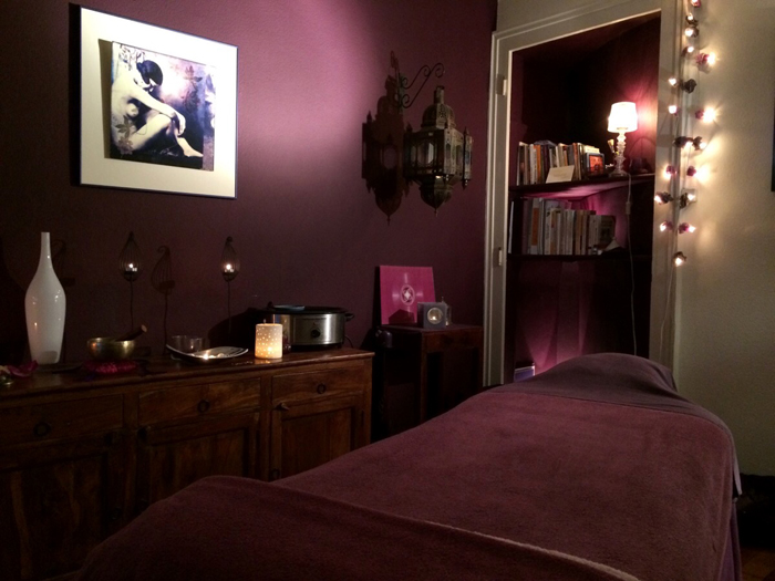 Rebecca doit avoir les oreilles qui sifflent à force d’être mentionnée dans mon article ;o) A croire que j’ai passé tout le mois de décembre chez elle ! J’y suis allée en fait deux fois : la première fois pour les bijoux Uzume et la deuxième fois pour un massage exquis offert par ma copine Madame pour Noël 2013 (elle est trop cool, ma copine Madame, hein ? Hé bien, vous savez quoi, je la garde pour moi, na !) dont elle a le secret. Dans une pièce magique propice à la détente et décorée avec beaucoup de goût, je me suis laissée transporter après quelques instants de bavardage dans cet état à mi-chemin entre l’éveil et le sommeil, apaisée par les mains expertes de Rebecca, la musique relaxante et le doux parfum des bougies. Un rêve hors du temps, d’autant plus jouissif quand il fait sombre et froid !