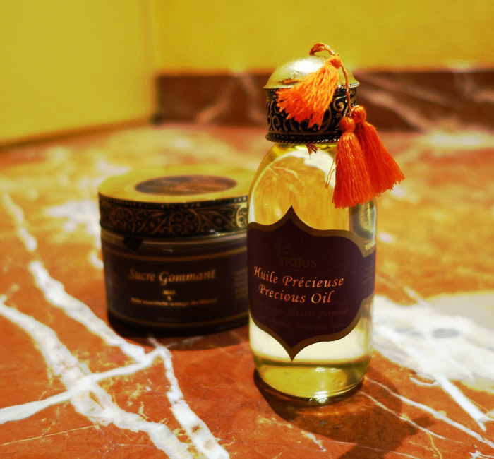 10 décembre. Un sucre gommant au miel et huile essentielle orange du Maroc et une huile précieuse multi-usages à la fleur de Tiaré Natus Marrakech