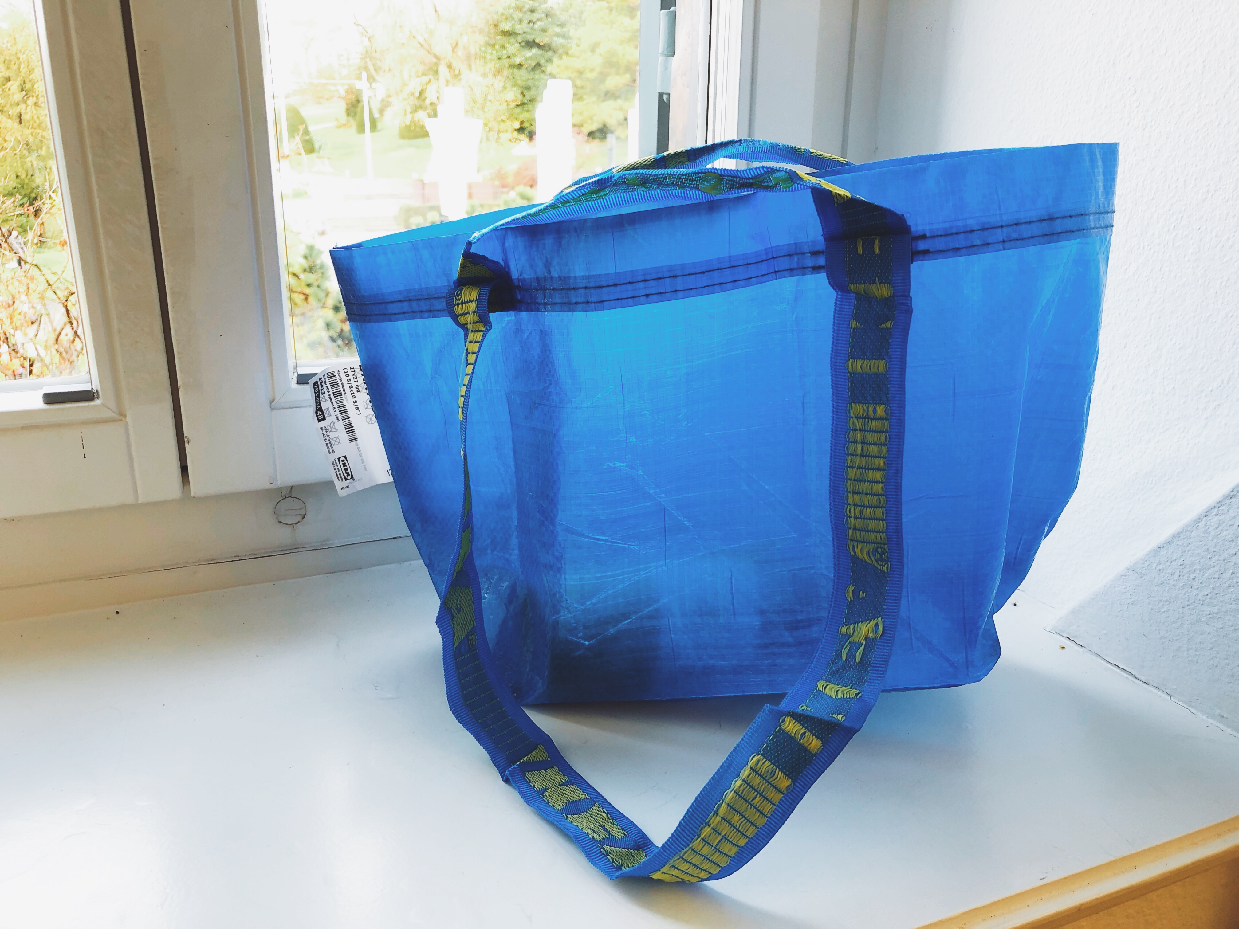 Je suis sûre que j’ai des objets dont je dois me débarrasser à la maison mais ces temps, je suis plus dans une dynamique d’en acheter pour meubler le chalet que de m’en défaire. Aujourd’hui, j’aimerais mettre en avant ces petits objets utiles du quotidien, qui nous rendent service en toute discrétion et modestie comme le mini sac bleu Ikea vendu à CHF 0.65 (CHF 0.75 ?) pièce. Je l’utilise comme lunch bag (sac à déjeuner ?) pour transporter mes boissons et mes repas au bureau.