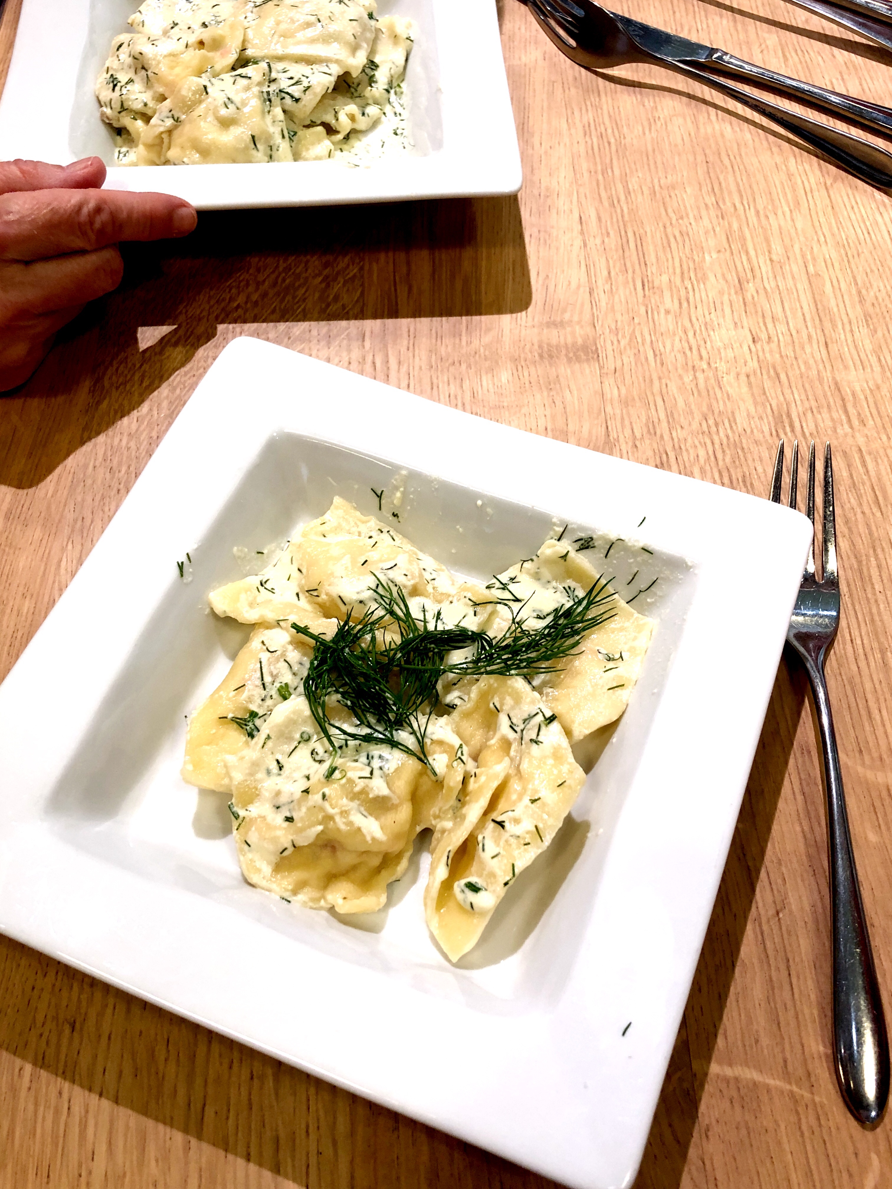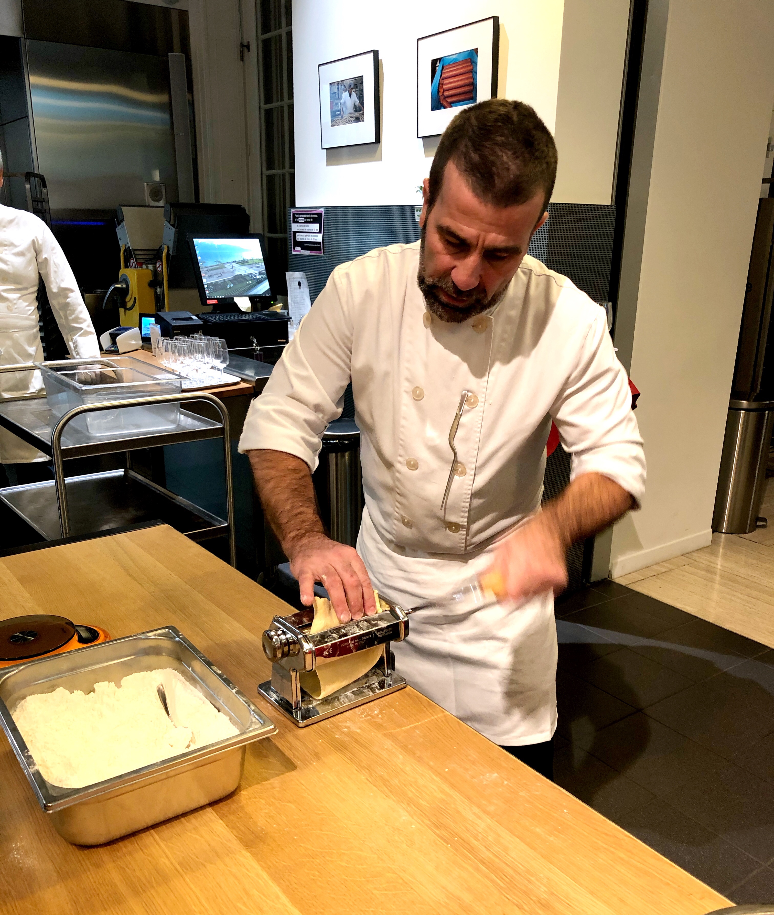 J’ai bien aimé le cours (j’ai utilisé un laminoir et fais de la pâte feuilletée pour la première fois de ma vie) mais j’ai trouvé que la recette pour la pâte à raviolis était trop basique et manquait de saveur (un œuf, de la farine et c’est tout) et regretté que la fin du cours soit trop vite expédiée parce que nous avions pris du retard. J’aurais aussi voulu entendre Chef Philippe nous parler plus longtemps de la dynamique du groupe, du leadership des uns et des autres et de la personnalité qui transparaît dans le dressage des assiettes, ce qui m’a le plus intéressée.