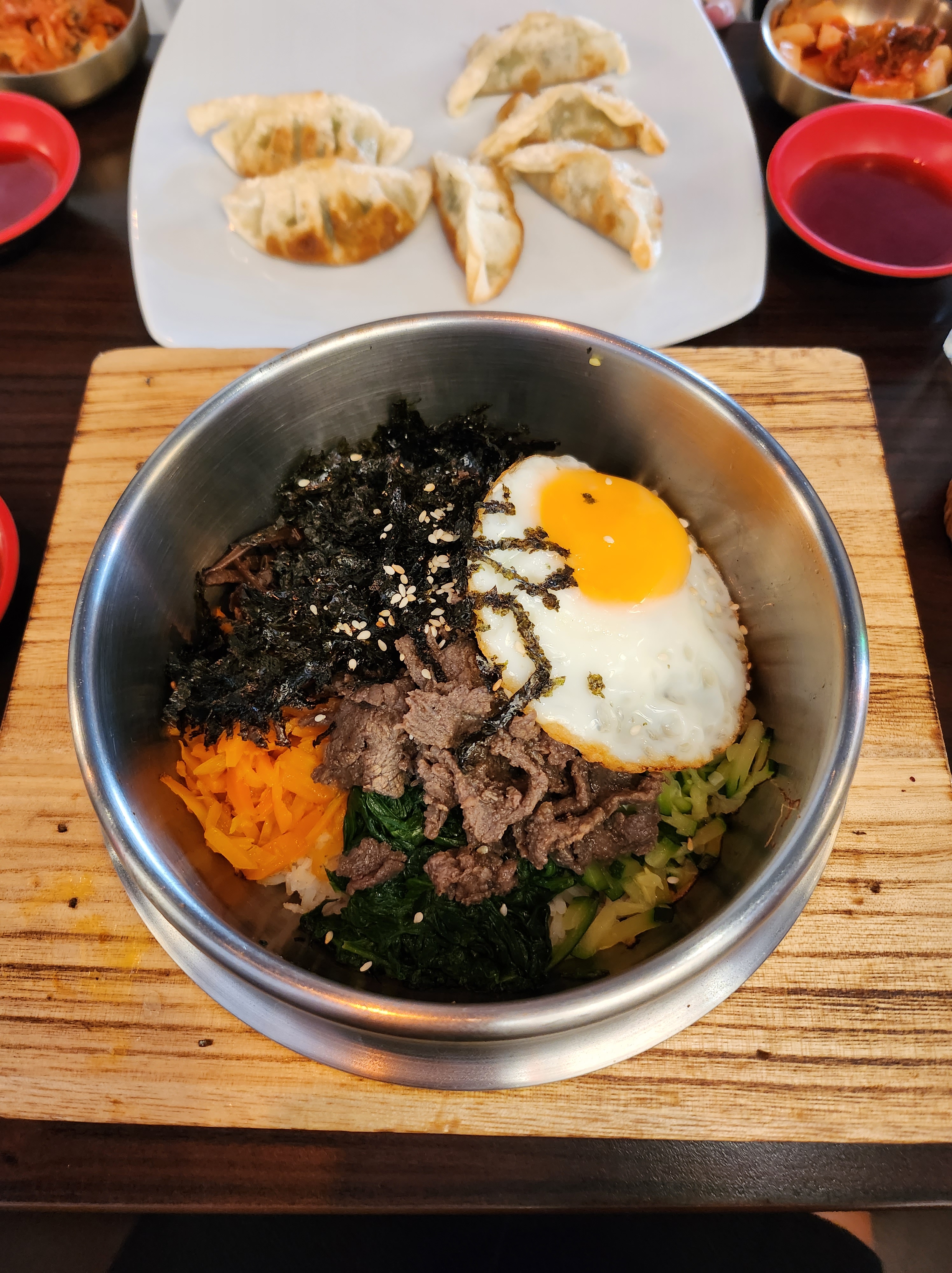 Dotori sert une très bonne cuisine familiale à partir des basiques de la cuisine coréenne. On y trouve des plats rassurants comme le bibimpap, le riz aux légumes et à la viande plein de saveurs (miam, le reste de riz frit collé au fond du bol. Je me rappelle qu’enfants, on se battait avec mes cousins pour avoir la chance de le manger), des soupes, des raviolis sautés (mandu), des plats de viande (bulgogi), des nouilles (japchae et ramen) et des kimpap à ne pas confondre avec les makis japonais.